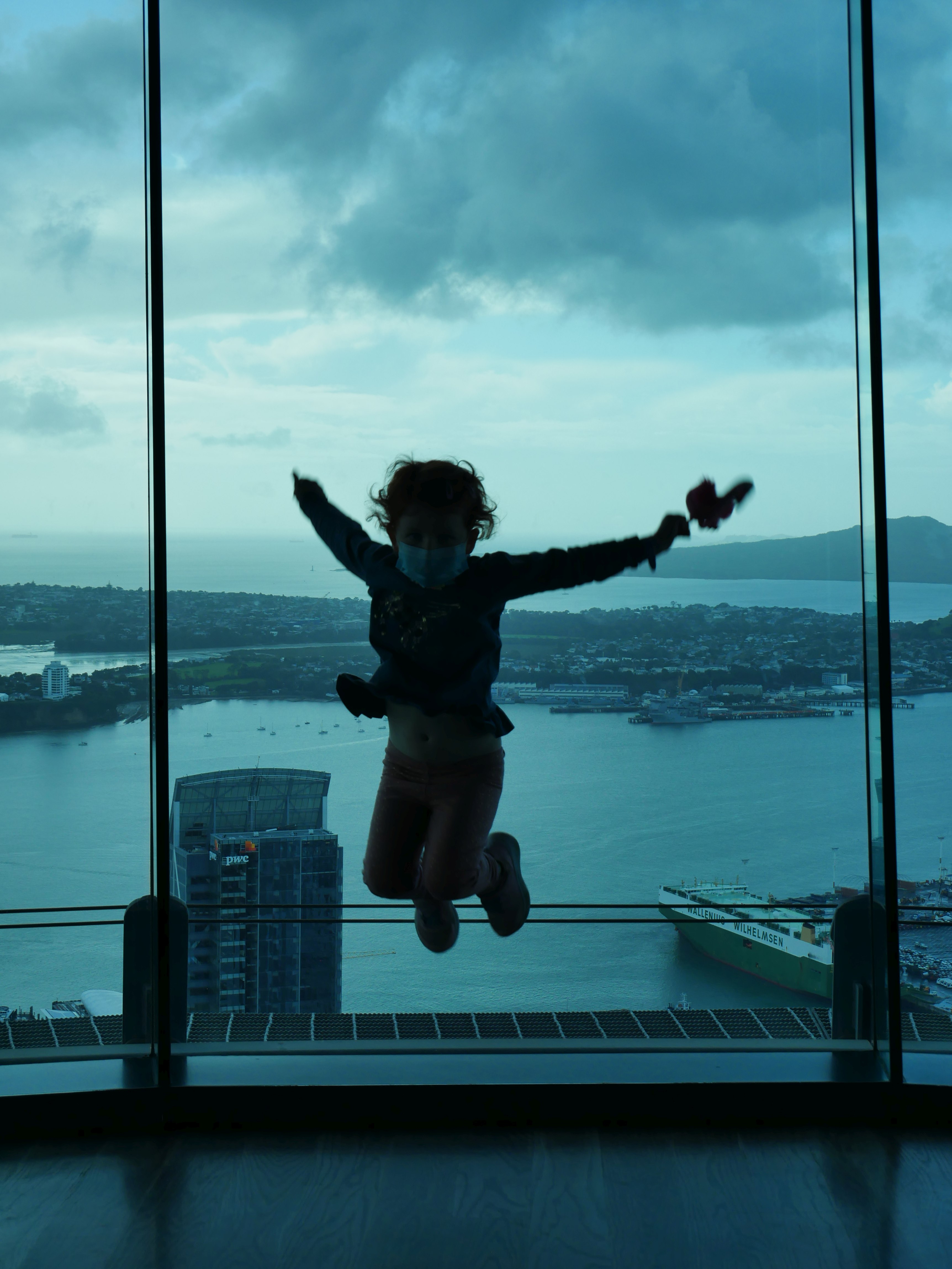 Et vous savez quoi ? A Auckland il y a une tour ! La SkyTower qu’ils disent mes parents ! et le plus fort c’est qu’elle brille la nuit, et chaque soir c’est la surprise de savoir quelle couleur elle va prendre ! Moi j’aime bien quand elle est rose ou arc en ciel ! Et on est même monté tout en haut !