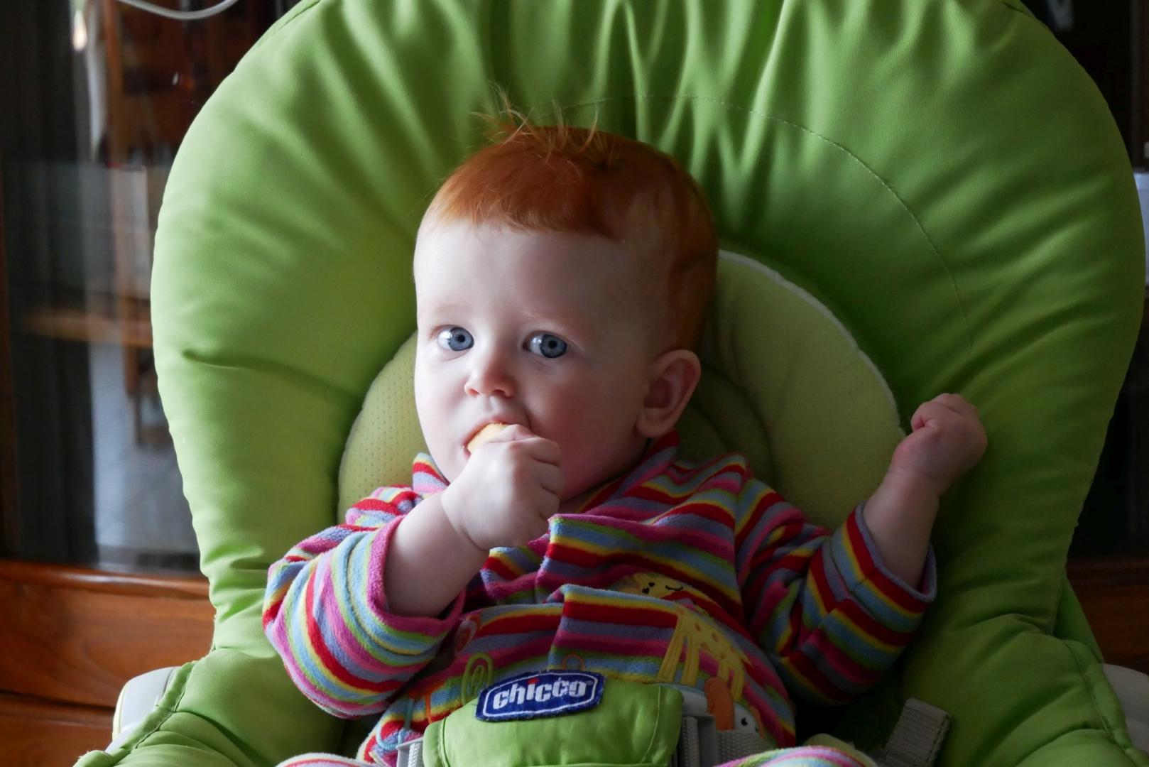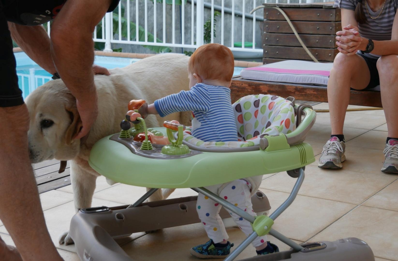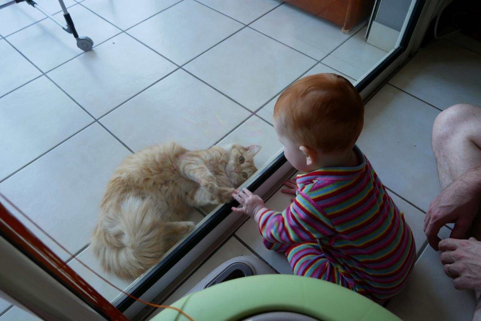 Autre truc curieux, un truc roux (comme moi!) que mes parents appellent « chat ». Apparemment il habite à coté de chez nous mais il aime venir nous voir. Alors nous on discute entre rousses : elle fait des petits bruits (comme moi !) et se roule (comme moi aussi, enfin seulement dans le lit pour moi, on ne me laisse pas ailleurs !). On se marre bien toutes les deux. Le chien chez mon grand-père aussi il m’intéresse … mais il a tendance à s’écarter quand j’arrive sur lui à fond sur mon trotteur. Pourtant moi j’aimerais bien lui tirer un peu les poils ! Pas sympa, il va falloir que je ruse.