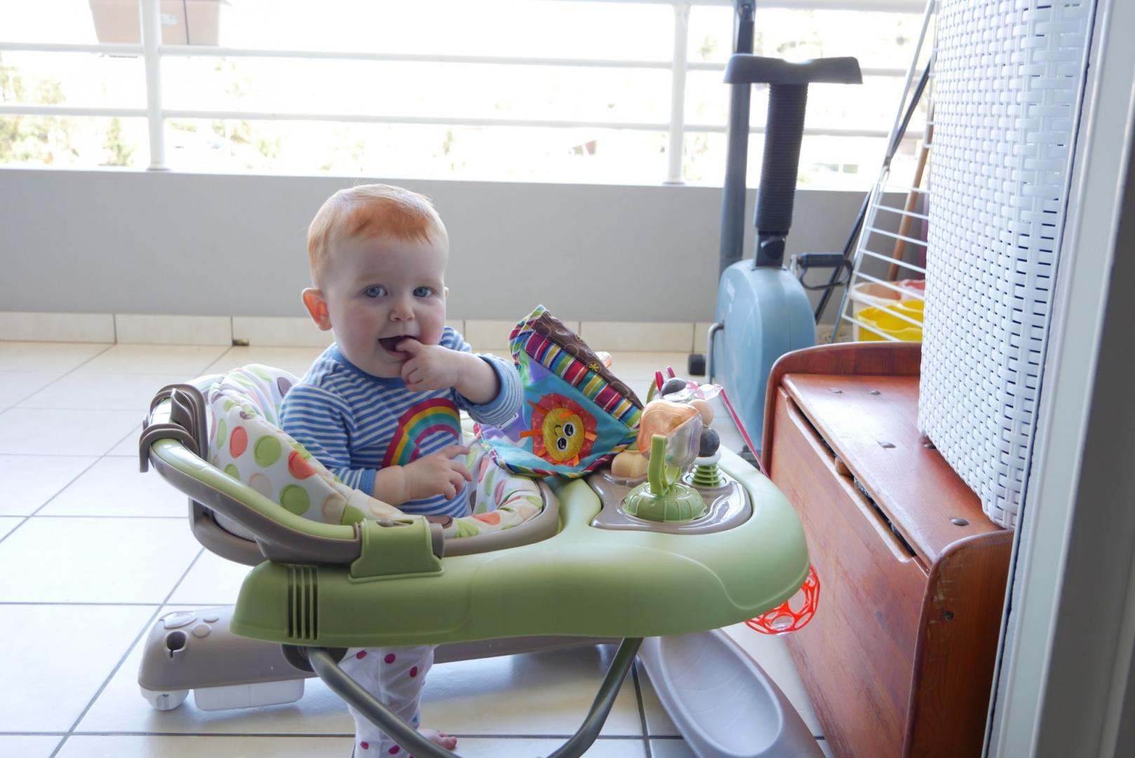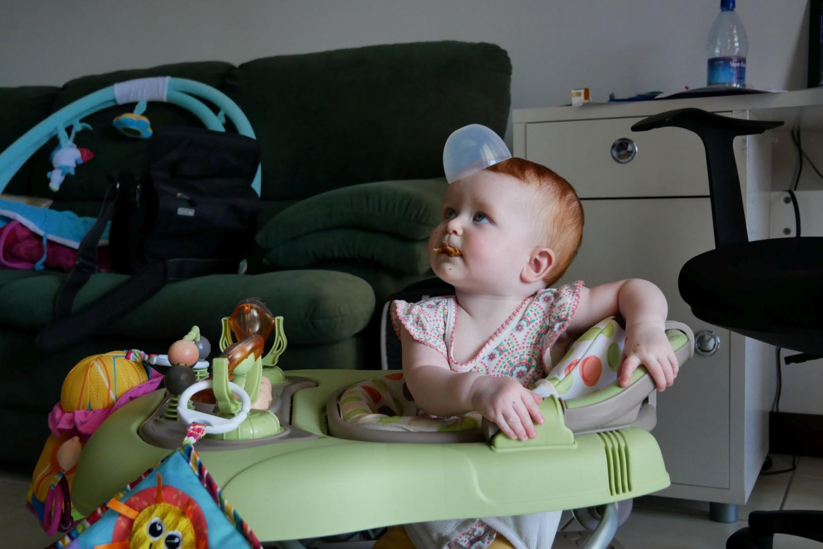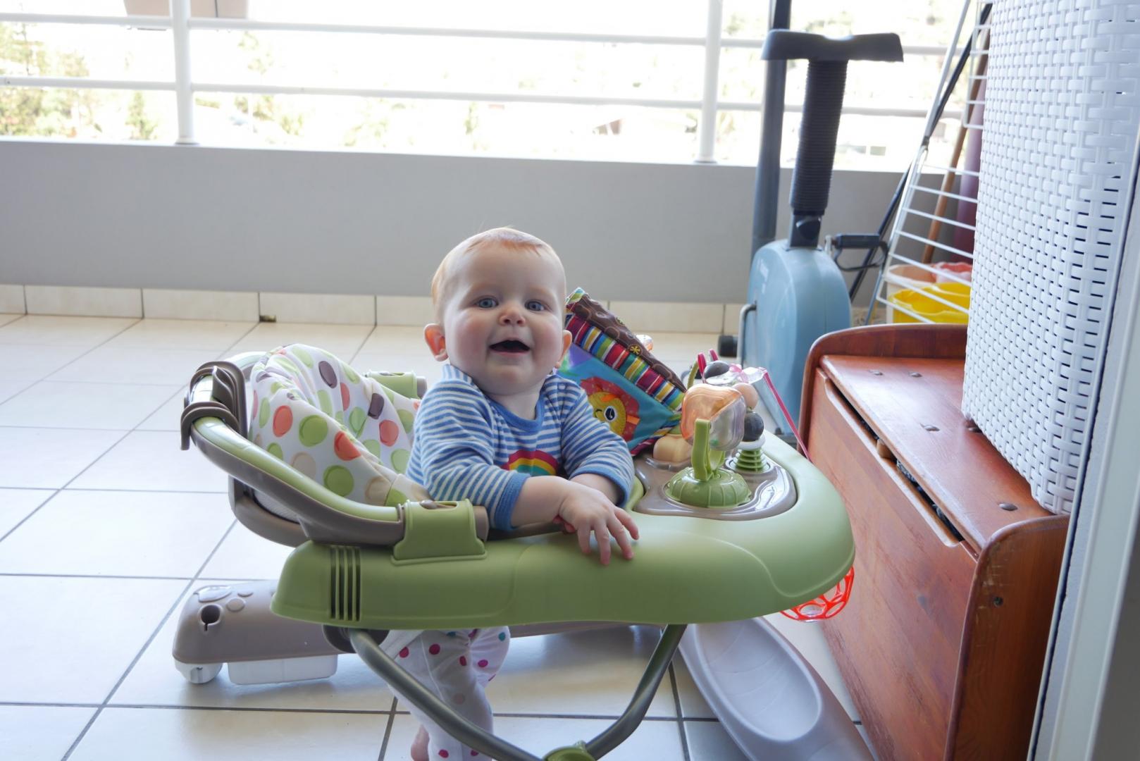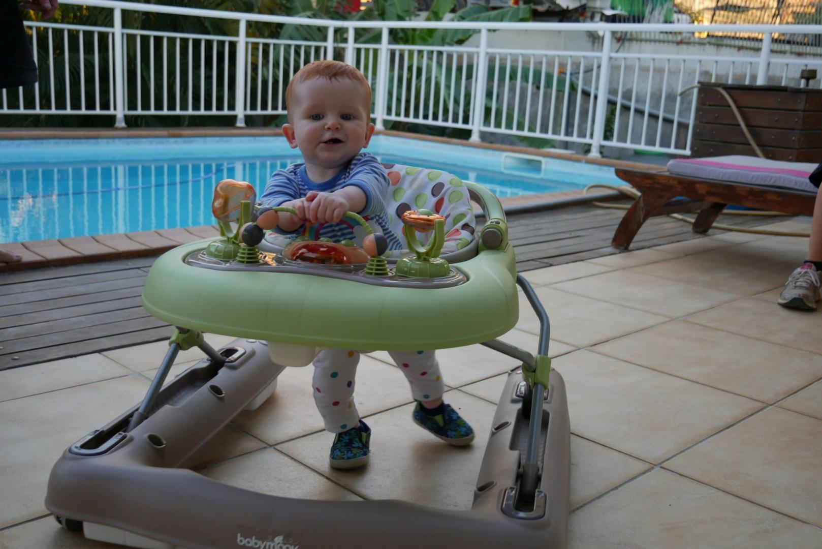 Cette semaine j’ai eu 8 mois. J’ai fêté ça en faisant du trotteur chez ma nounou en plus de chez moi … ça me permet d’essayer de suivre les autres. Je maîtrise de mieux en mieux la conduite de cet engin. Cette semaine je suis retournée pour la 3ème fois aux bébés nageurs, j’aime vraiment beaucoup l’eau : on peut taper dessus sans se faire mal et en plus ça en envoie partout.
