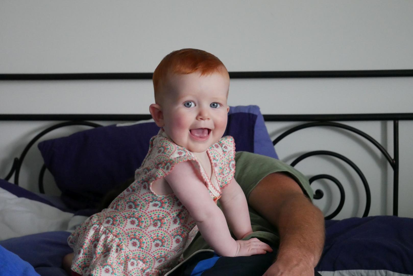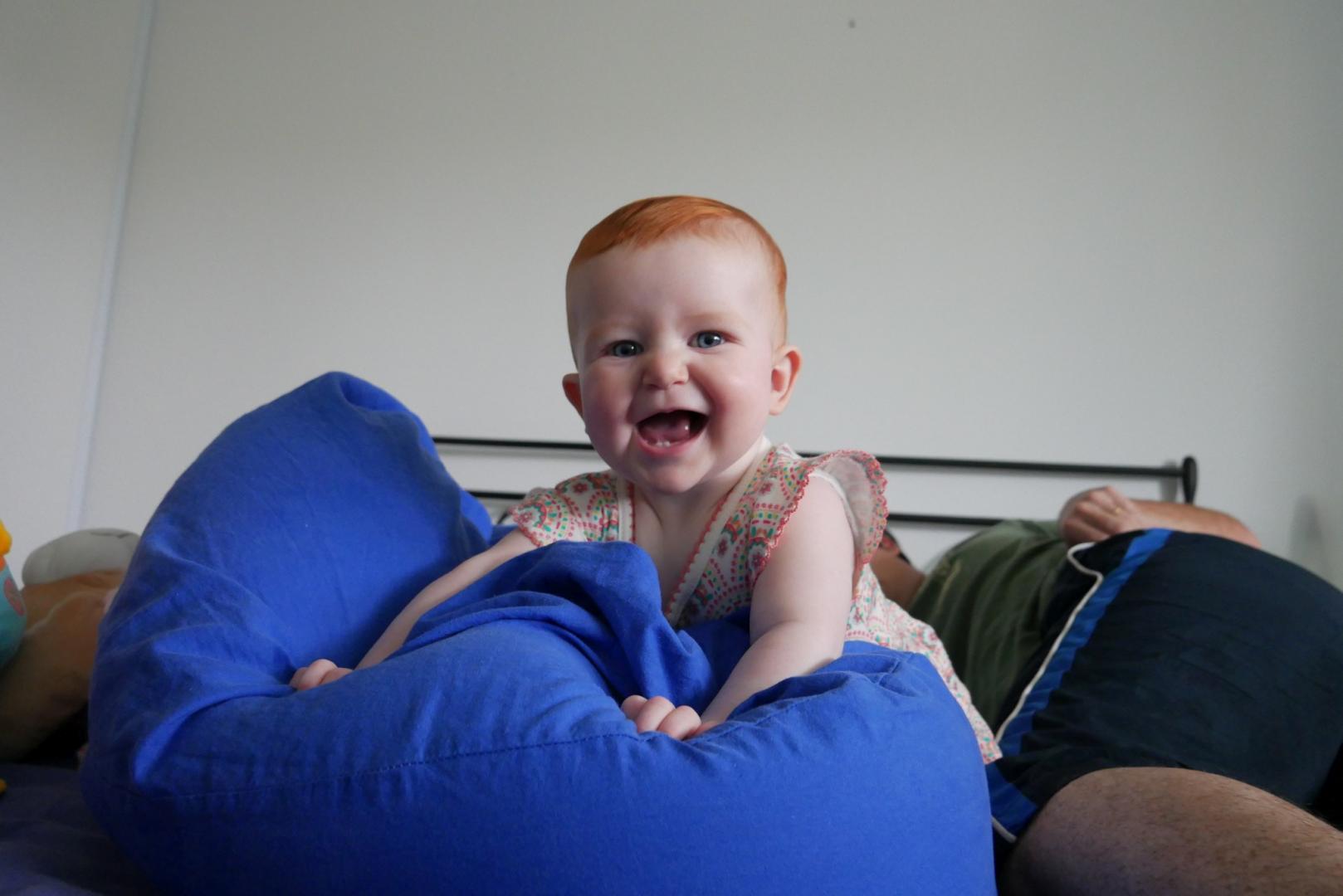 Du haut de mes huit mois, je me mets de plus en plus debout toute seule. A priori, mes cris ne laissent aucun doute sur mon niveau de contentement. Dans le lit surtout, pour des chutes aux doux amortis.