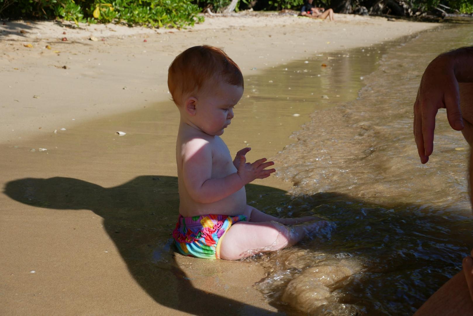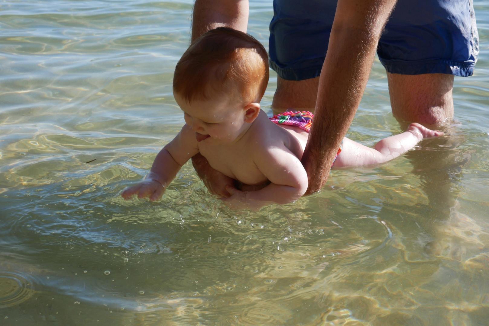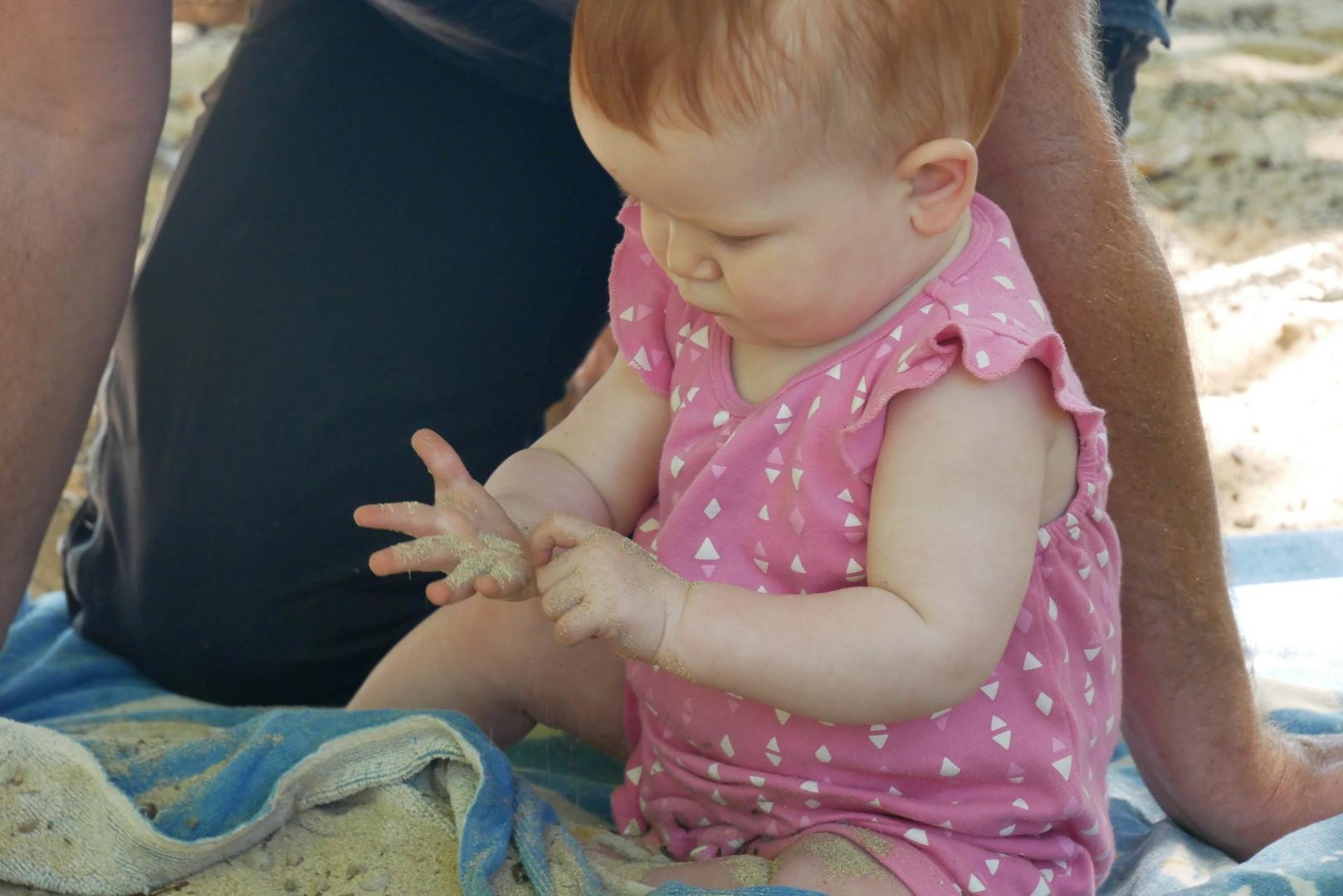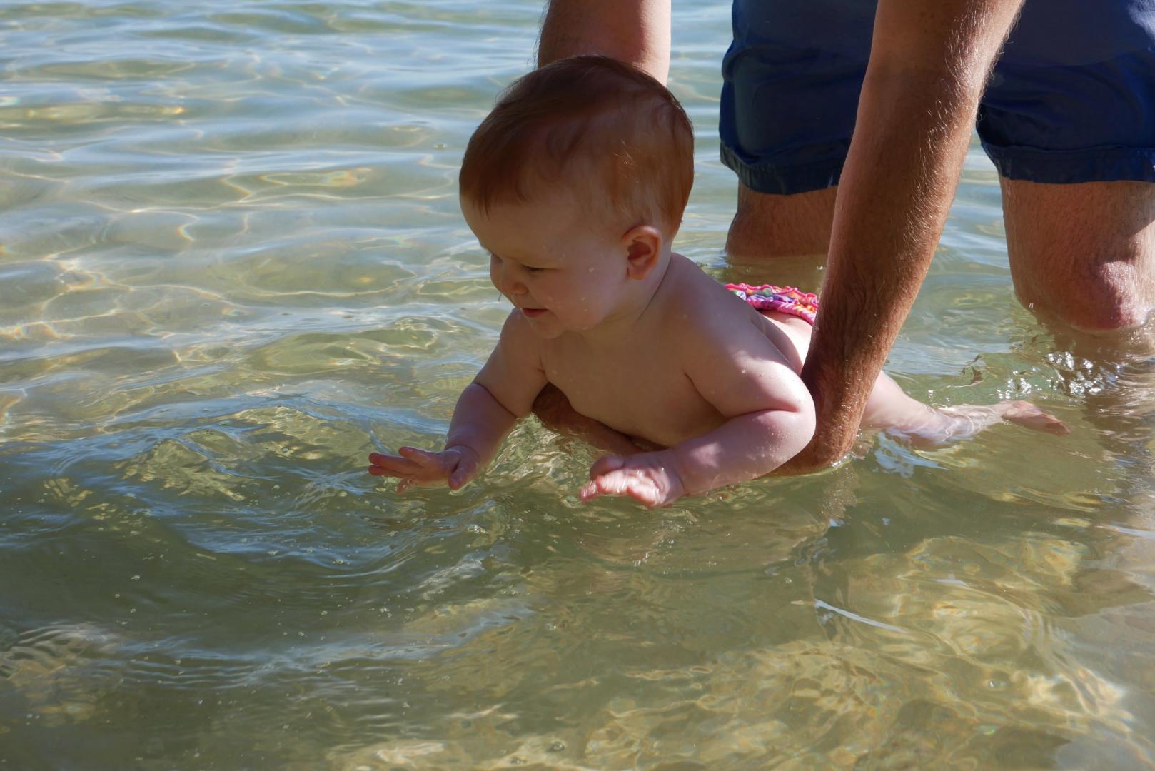 Comme promis, je vous tiens au courant du week-end. Alors déjà, moi on ne m’avait pas prévenue qu’il y avait « 2 heures » de voiture pour y aller, et quand je dis voiture c’est donc dans ma coque pour moi. No comment. Enfin voilà, une fois arrivée sur place, j’ai mangé (il était temps !). Et après on m’a posée sur une serviette entourée … de « sable ». Super étrange ce truc au début, j’ai longuement réfléchi puis finalement en y remettant les mains, c’est trop sympa ! ça vous glisse entre les doigts et tout ! Bon par contre ça colle aux doigts et aux pieds mais on ne peut pas tout avoir. Une petite sieste plus tard, me voilà sur une nouvelle découverte, la mer. Et oui, 9 mois passés et mes parents ne m’y avaient jamais mise ! Moi je connaissais l’eau, avec ma piscine de bébés nageurs mais là j’ai cherché le bord de l’autre coté de l’eau, et j’ai rien vu. Curieux. En tous cas l’effet de surprise n’a pas duré, je lui ai montré à cette « mer » comment on barbote de manière professionnelle.