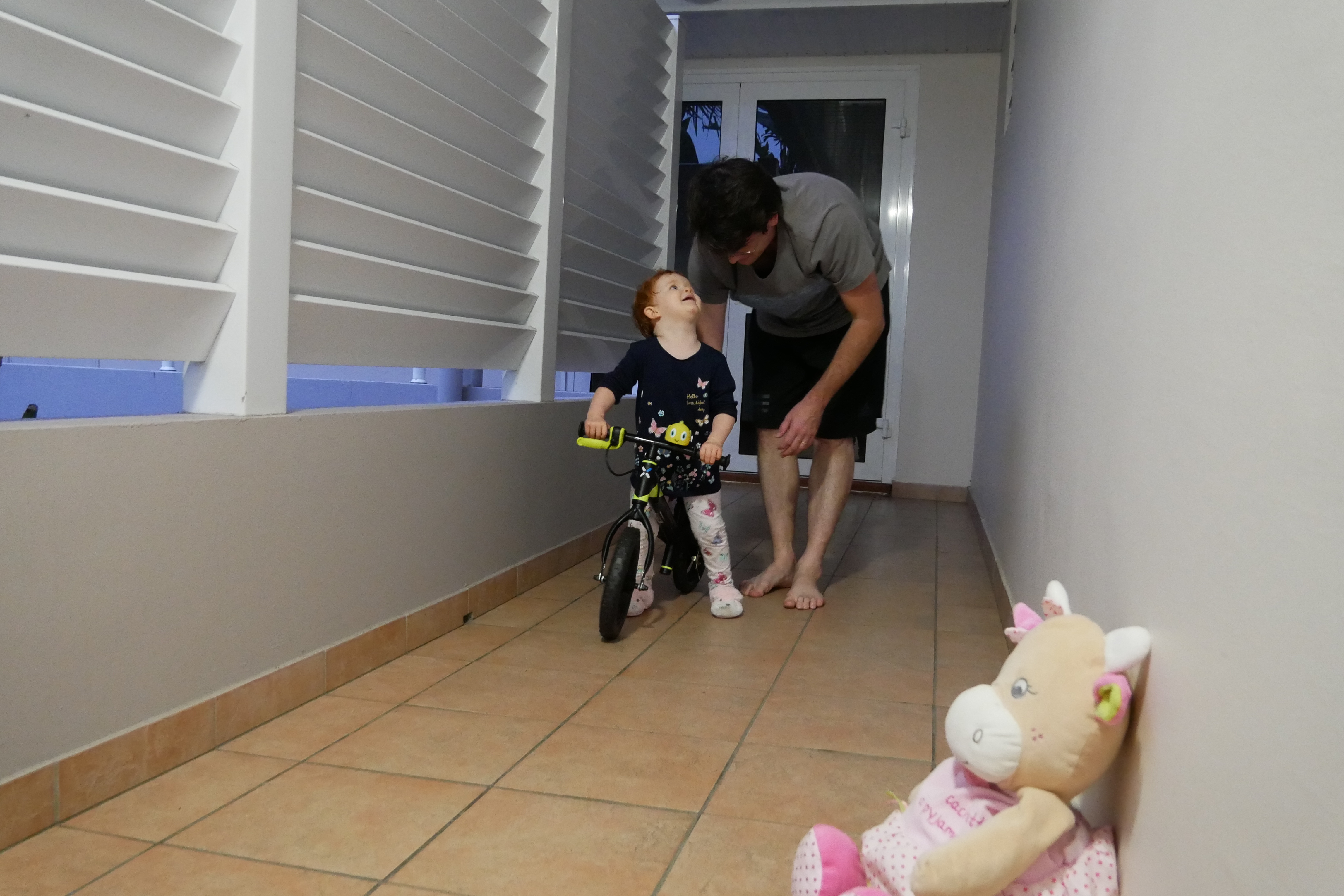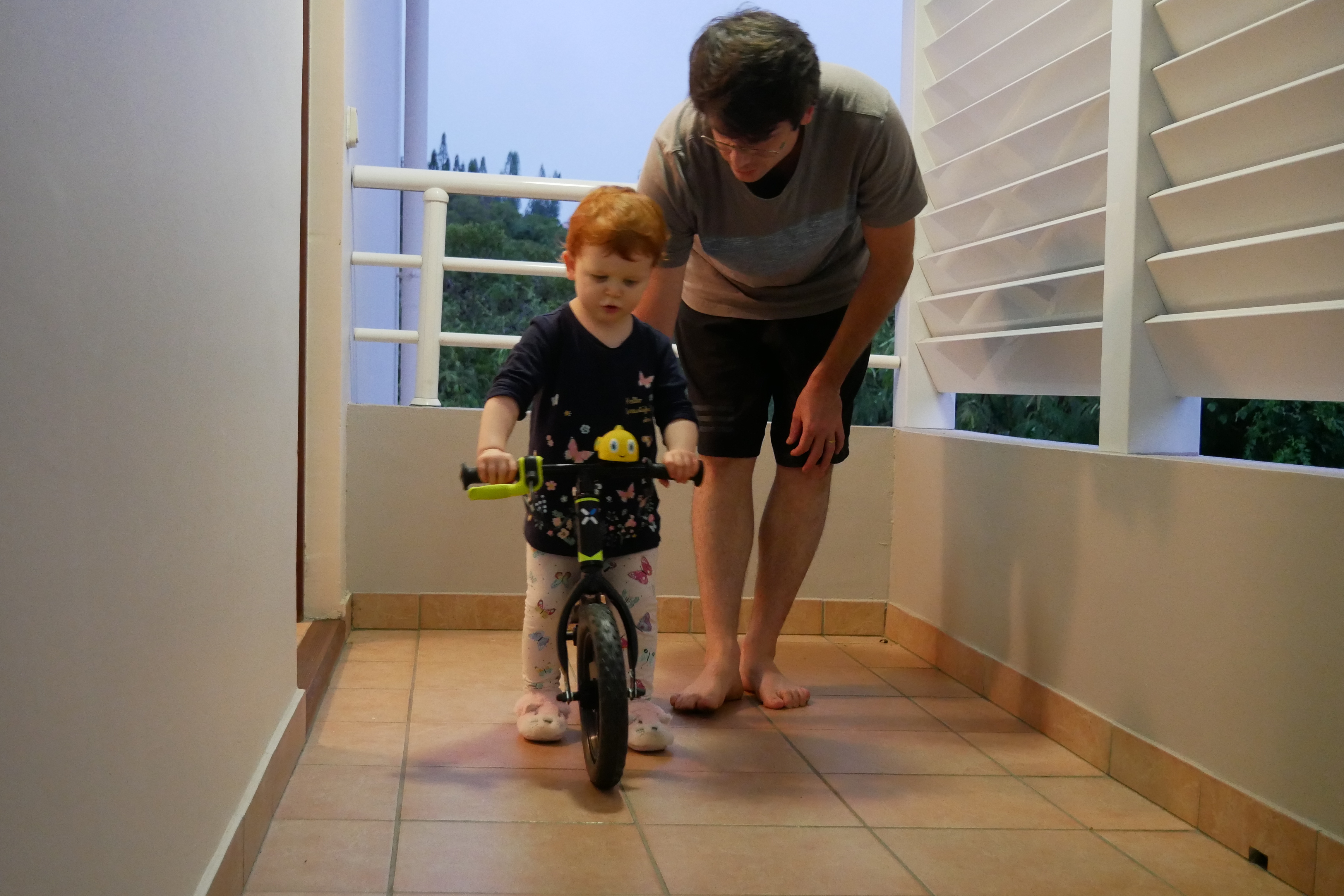 Mais ça ne m’a pas empéchée de faire plein de choses, vous imaginez bien. Le matin j’ai emmené mes parents faire un tour au centre culturel, en bord de mer. Et l’après midi, la pluie étant vraiment forte, du coup j’ai essayé mon nouveau vélo dans le couloir. Et ça m’a vraiment plu !