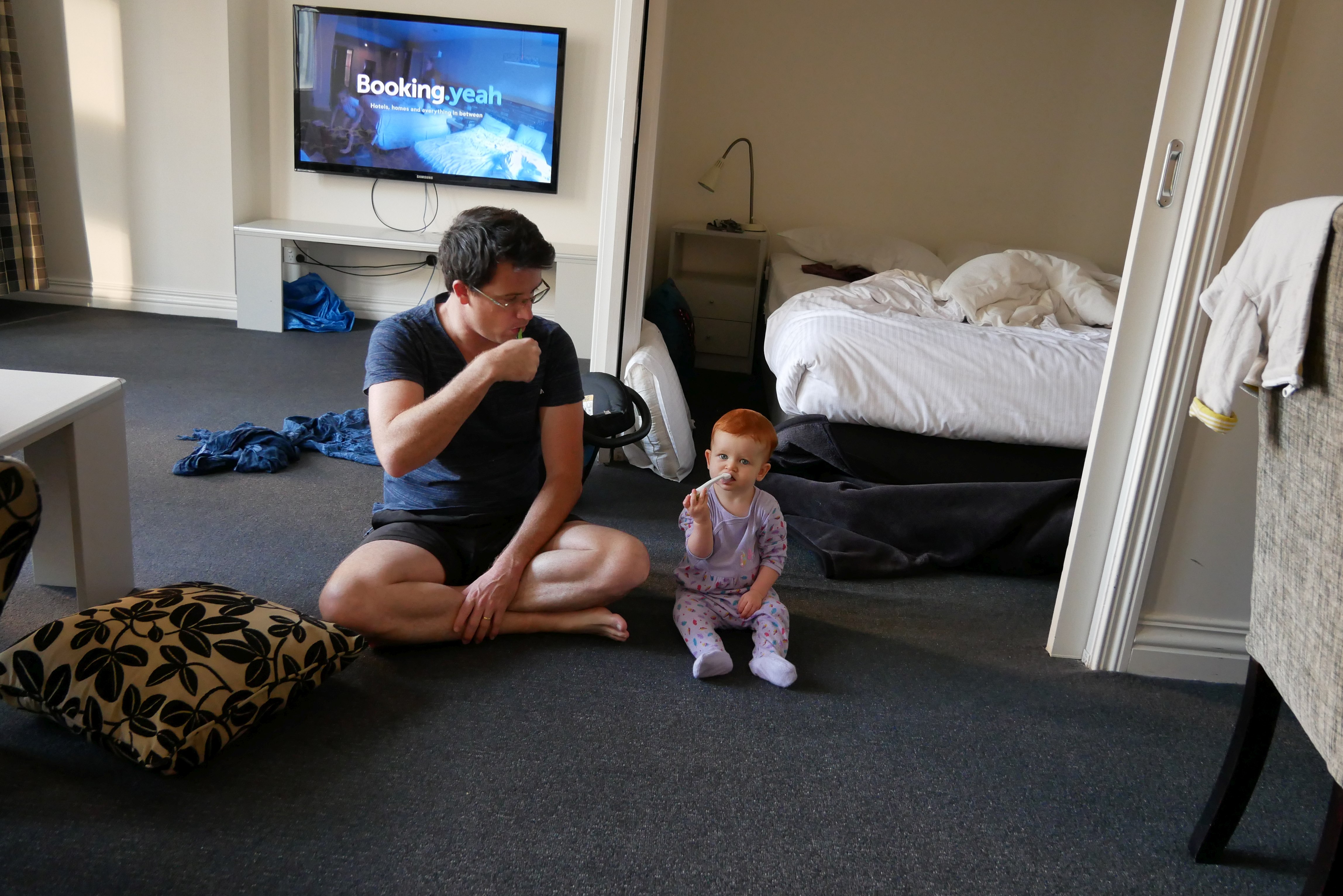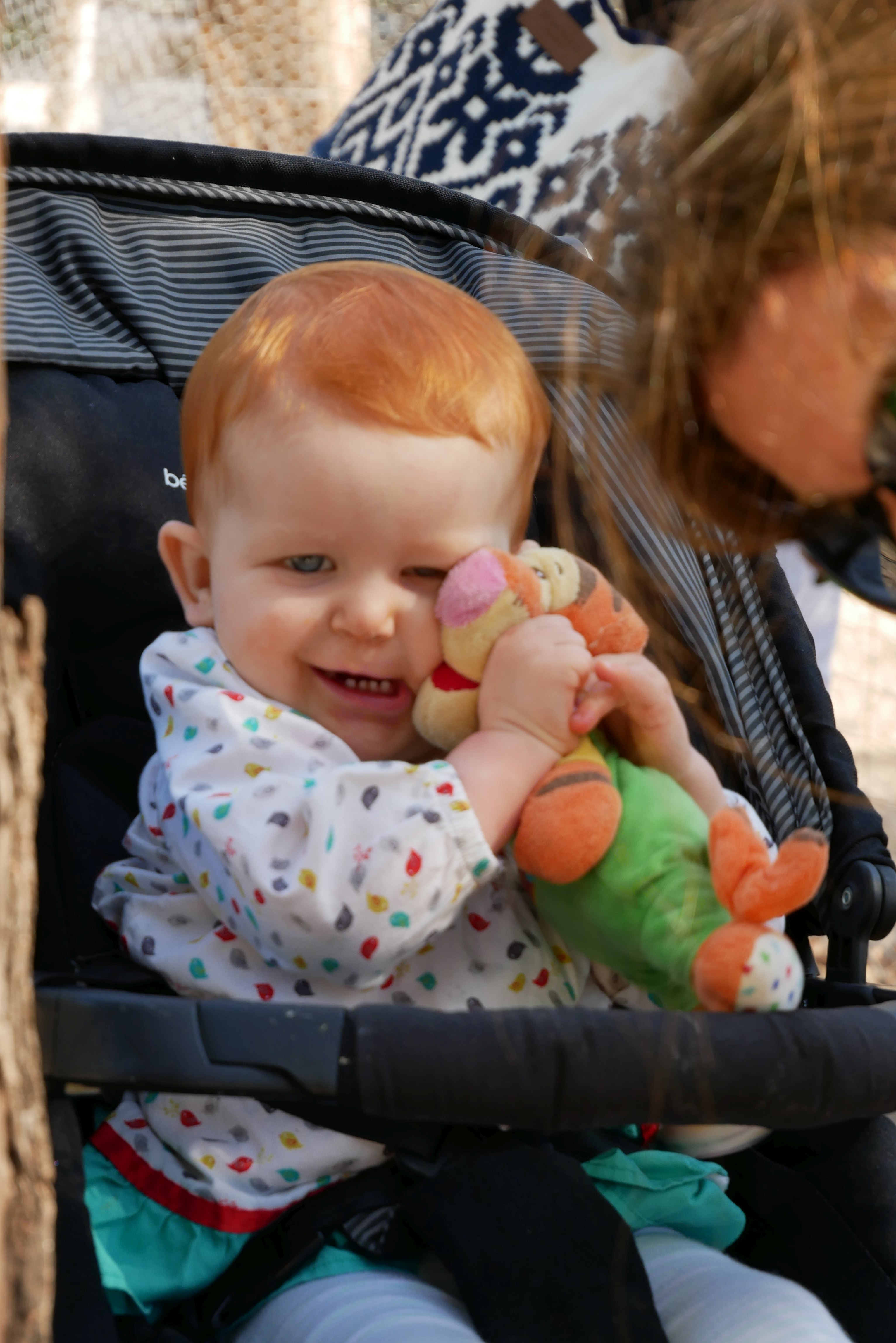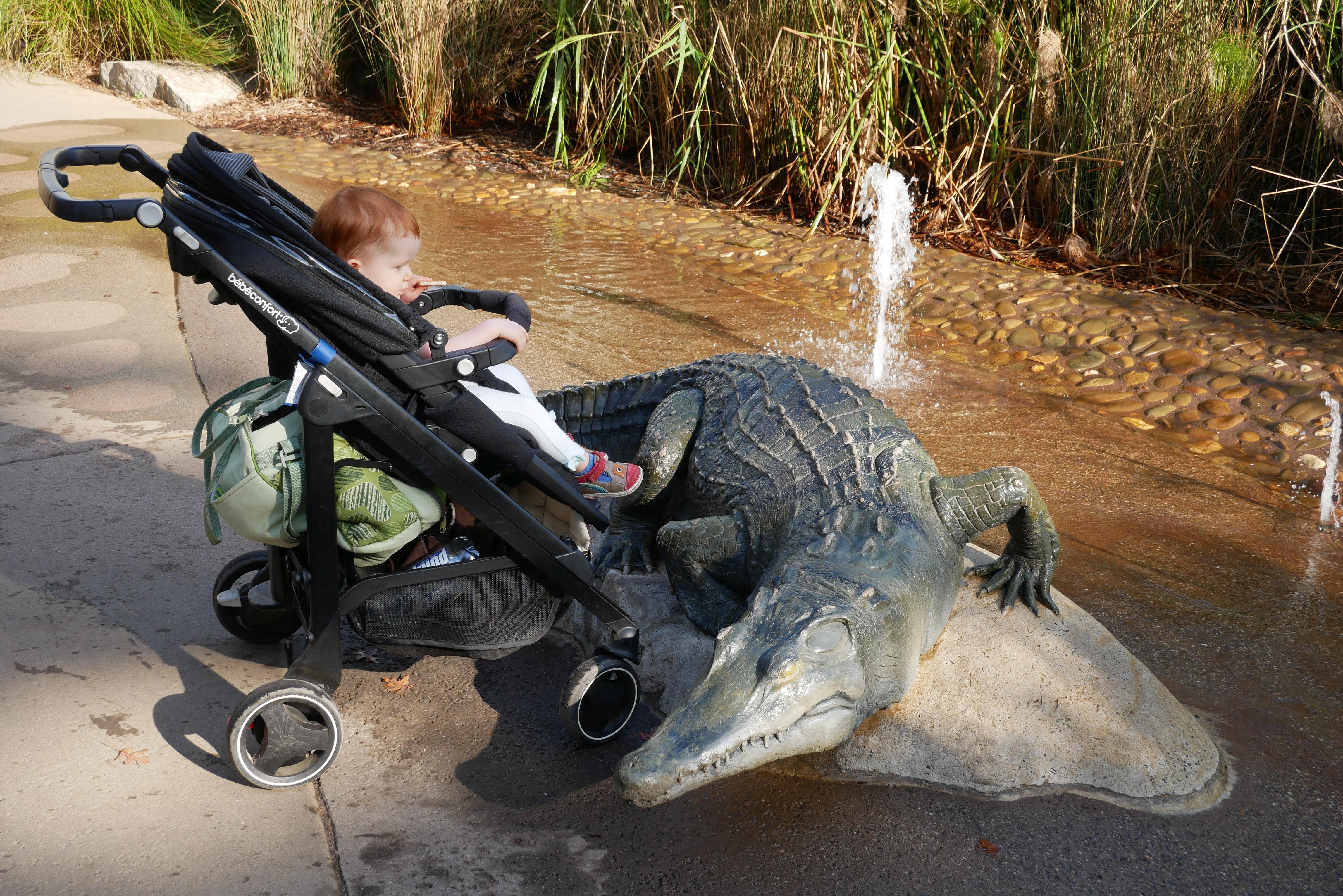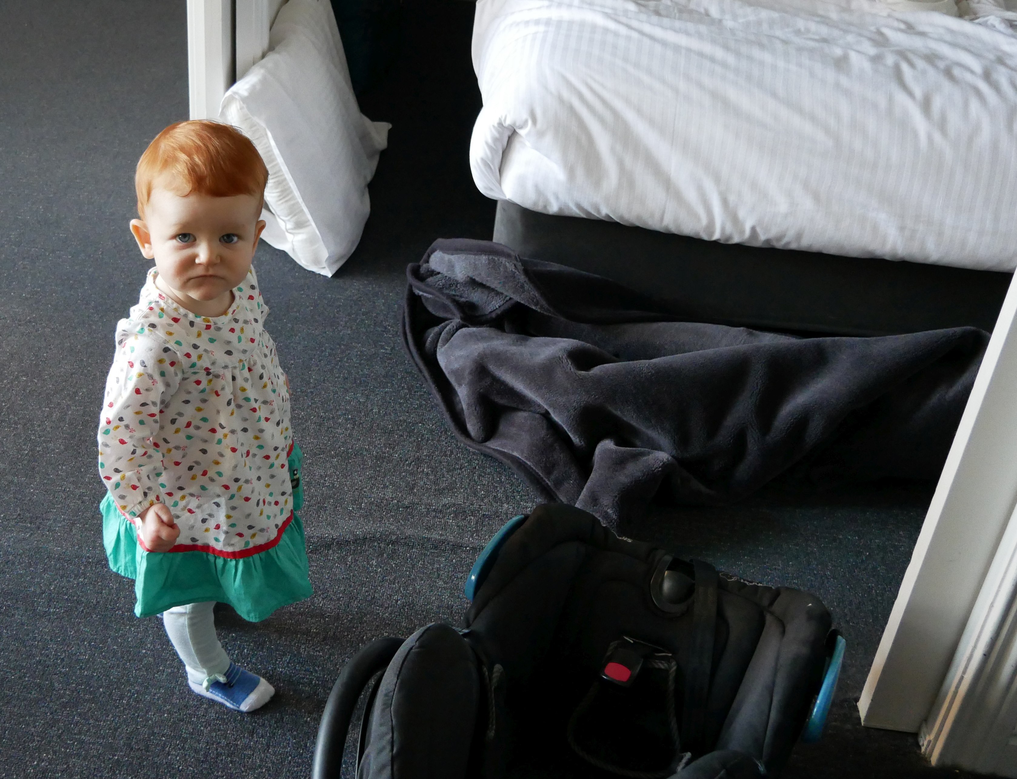Ensuite on a roulé dans une voiture que je ne connaissais pas, et on est arrivé à l’hôtel. J’ai cru comprendre que c’est là qu’on va habiter un peu. Elle est très bien la chambre d’hôtel, j’ai commencé à l’explorer dès le début et j’y ai fait une bonne sieste. Ensuite on s’est promenés, avant de partir on m’a mis tout plein de vêtements … qu’est-ce que c’est que cette histoire de mettre plusieurs vêtements ? j’espère qu’ils n’auront plus ce genre d’idées tordue mes parents. Pendant la promenade je suis restée dans ma poussette et j’ai contemplé.