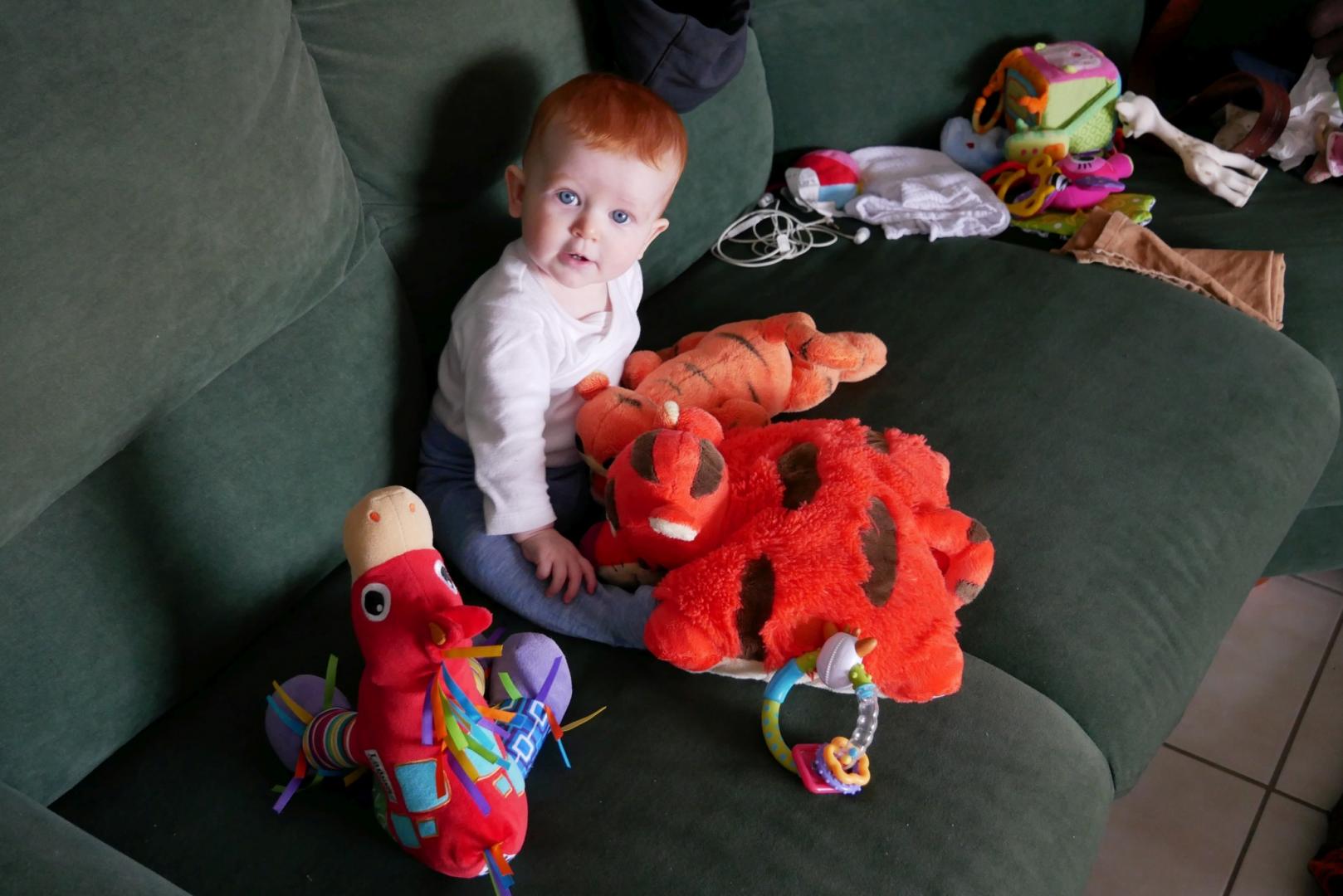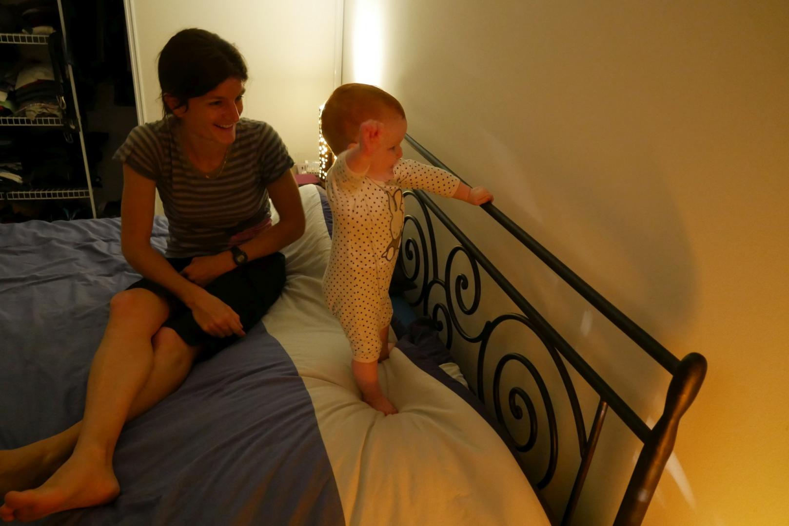Du haut de mes huit mois, je me mets de plus en plus debout toute seule. A priori, mes cris ne laissent aucun doute sur mon niveau de contentement. Dans le lit surtout, pour des chutes aux doux amortis.
