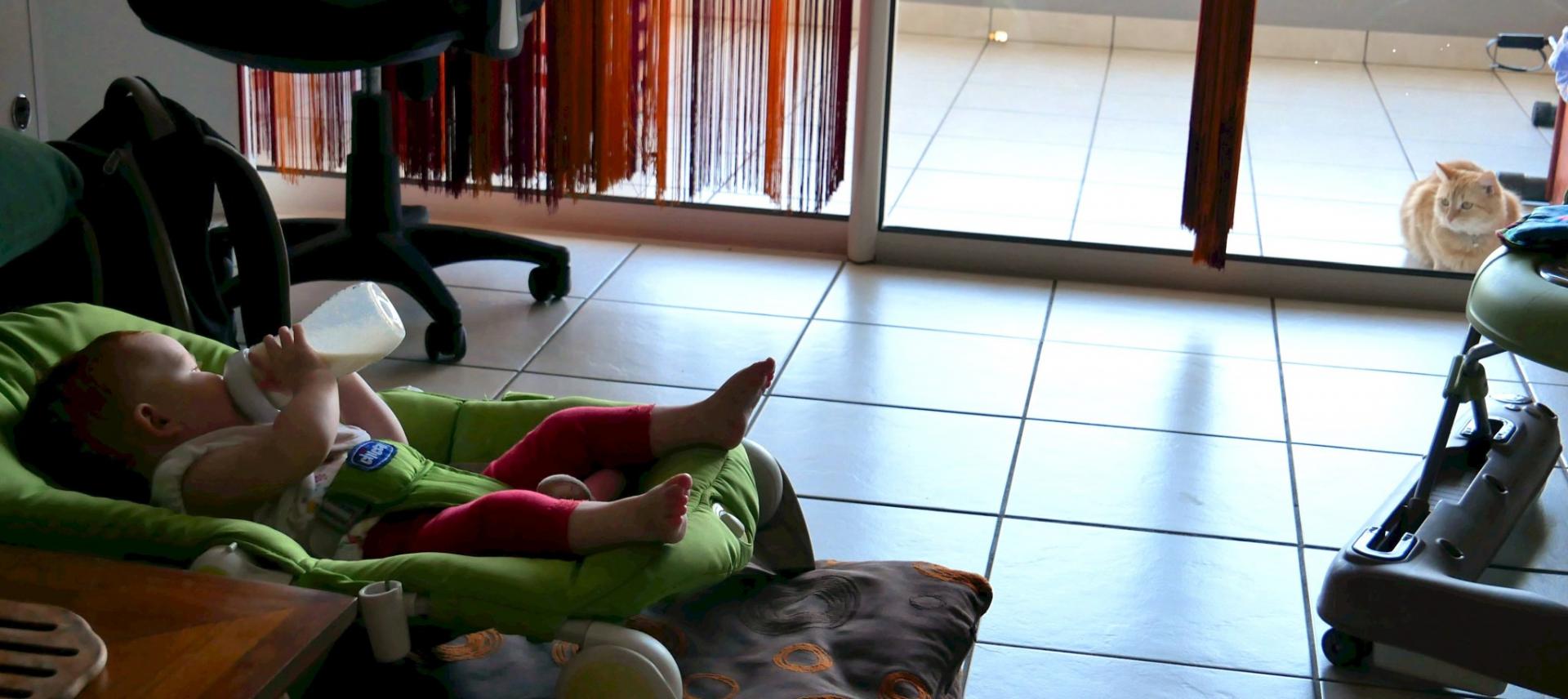Autre truc curieux, un truc roux (comme moi!) que mes parents appellent « chat ». Apparemment il habite à coté de chez nous mais il aime venir nous voir. Alors nous on discute entre rousses : elle fait des petits bruits (comme moi !) et se roule (comme moi aussi, enfin seulement dans le lit pour moi, on ne me laisse pas ailleurs !). On se marre bien toutes les deux.  Le chien chez mon grand-père aussi il m’intéresse … mais il a tendance à s’écarter quand j’arrive sur lui à fond sur mon trotteur. Pourtant moi j’aimerais bien lui tirer un peu les poils ! Pas sympa, il va falloir que je ruse.
